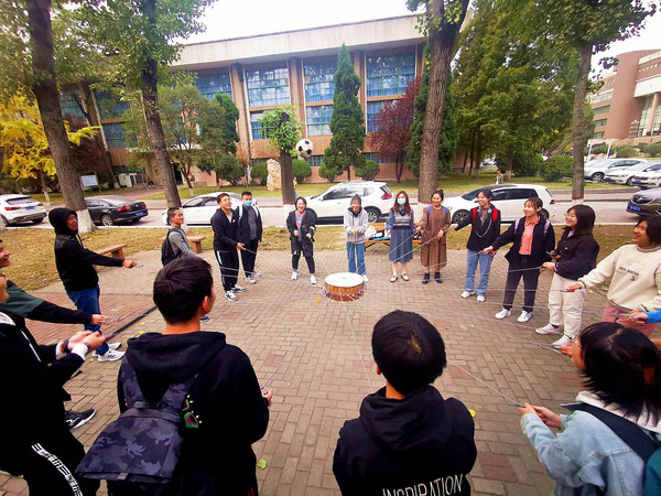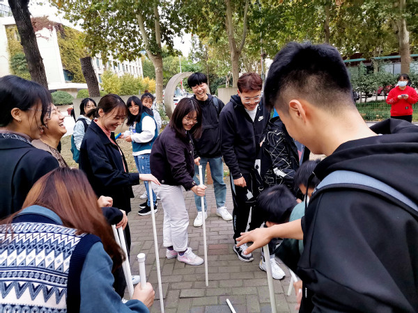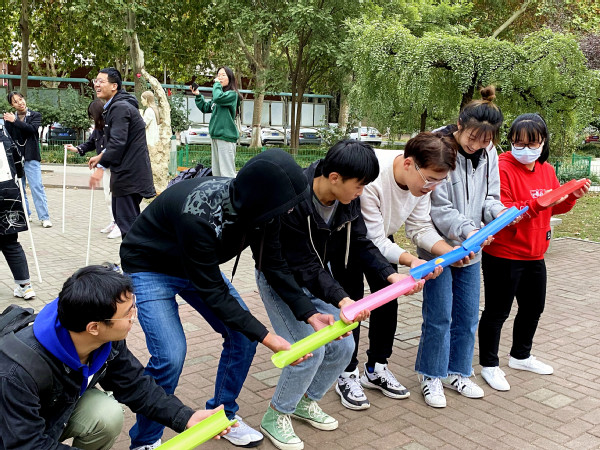 “快乐的一天”是以舒缓情绪、增进友情为目的素质拓展活动,此次活动共有三个环节,分别为同心鼓、高山流水和不倒森林。在“同心鼓”游戏环节中,同学们每人握住同心鼓的一根绳子并将绳子拉紧,一个人扔球大家用鼓来接,同学们必须齐心协力才能用绳子控制同心鼓的方向以及接球的力度,在经过几次失败后,大家逐渐掌握了技巧并最终获得了成功,同学们积极参与,现场气氛热烈。在“高山流水”游戏环节中,同学们被随机分成两组,组员们用乒乓球模拟流水,依次用工具接球,两组同学配合默契,现场笑声不断。在最后进行的“不倒森林”游戏环节,同学们在班委的引导下围成一个圈,一人手握一根棍子模拟森林,传递棍子期间要保证棍子不能倒下,当转完一圈重新回到原点即为成功,大家互相配合,团队协作。游戏结束后,大家合影留念,记录下这富有意义的时刻。