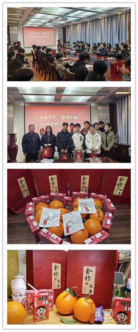 学院精心准备的“金榜题名加油福袋”,有寓意“平平安安”的苹果、“心想事成”的橙子、“运气旺旺”的旺仔牛奶、“成绩帮帮”的棒棒糖,饱含着对考研学生的浓浓关爱和深深情意。座谈中,学院党委书记张辉老师勉励同学们要坚定信心、调整状态、舒缓压力,以最佳的精神面貌迎接考试。满载真挚祝福的卡片,承载着沉甸甸的祝愿与期盼。接过饱含温暖和祝福的礼包,同学们倍感振奋,纷纷表示将以更加饱满的精神状态投入到即将到来的考试中,相信这份厚重的爱,定能助力大家一战成“硕”,成功上岸。
