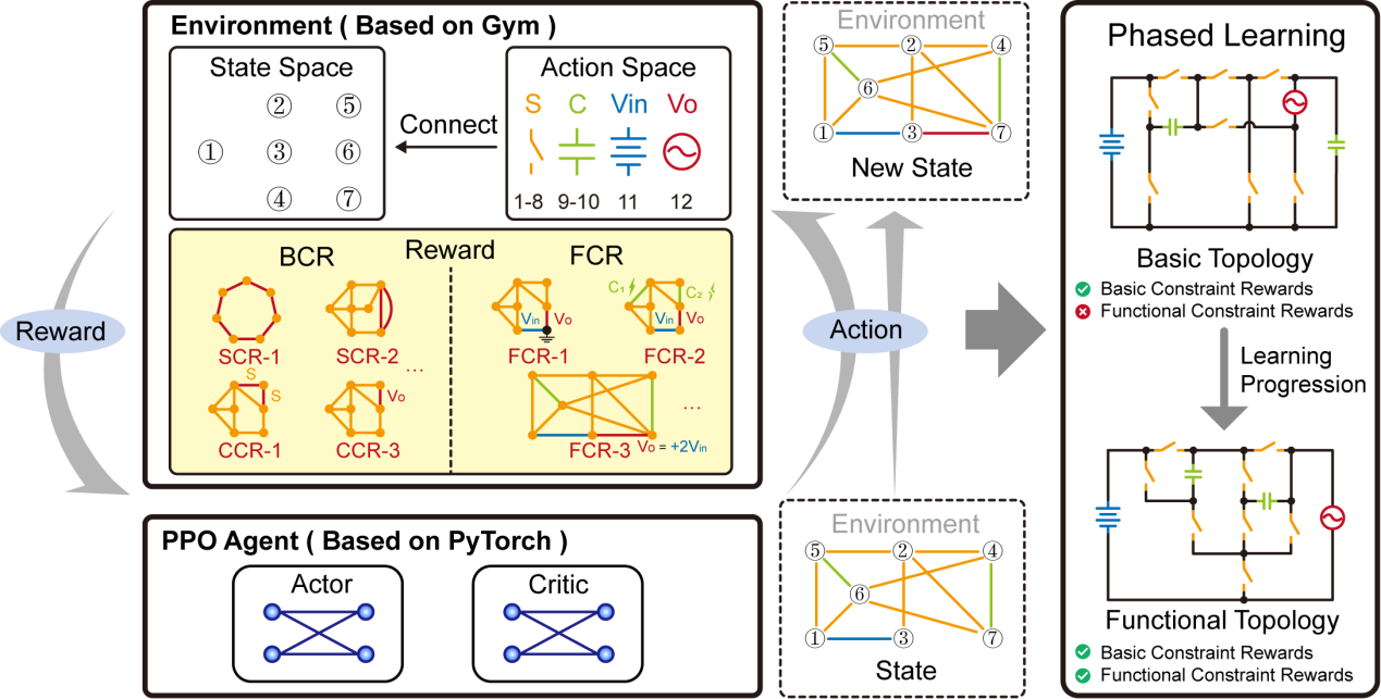 在人工智能展现出强大的多目标优化与搜索能力的背景下,为解决电力电子领域中因多开关器件数量所导致的自动化设计困难问题提供了极具前景的解决方案。传统的多电平拓扑设计长期以来深受该问题的困扰,极大地限制了新型电路的开发效率。为突破这一瓶颈,本文提出了一种基于强化学习的模块化、可扩展的自动推导框架,专门用于复杂多电平转换器拓扑的推导。该框架通过创新的分层奖励机制,将复杂的拓扑约束解耦为两个核心部分:1)用于正向设计的基础约束奖励;2)用于逆向设计的定制功能约束奖励。该研究将所有约束条件均编码为简洁的图论公式,从而彻底避免了复杂的数值计算过程。推导结果表明,该框架成功衍生出20种不同的五电平共地开关电容多电平逆变器结构,其中包含多种尚未被发现的全新拓扑配置。最后,团队对其中一种具有代表性的新型拓扑进行了硬件实验,充分验证了其功能的完整性,并证明了该自动化推导框架的有效性。